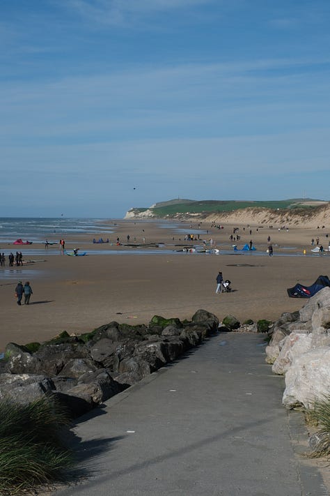 À Wissant, le vent souffle fort et attire surfeurs ou kiters. On s’offre une gaufre au bout de la digue pour profiter du spectacle.